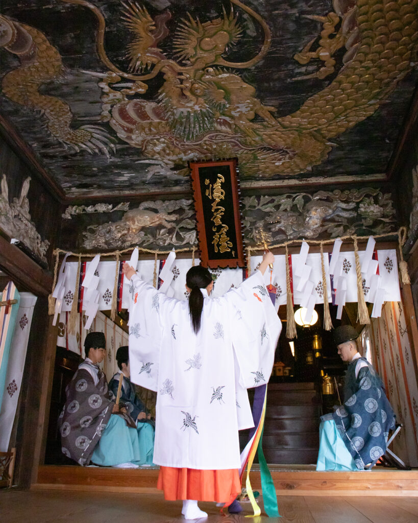 宮司により祝詞が奏上され、巫女による浦安の舞が奉納されます。