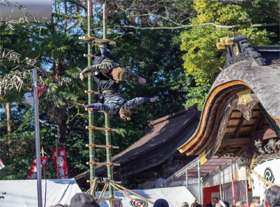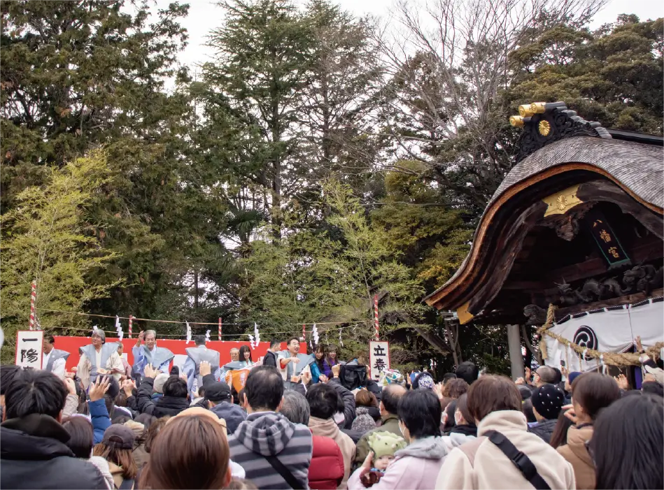 初詣では、約3万人の参拝者で境内はにぎわいます。地元鼓動会による年初めの太鼓や消防団による出初式なども行われます。