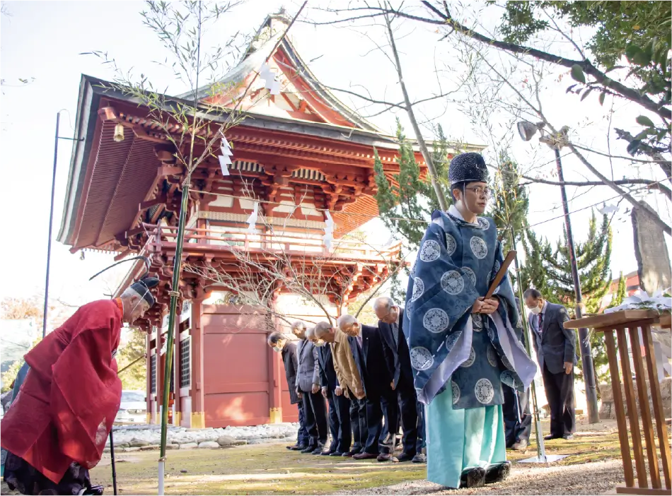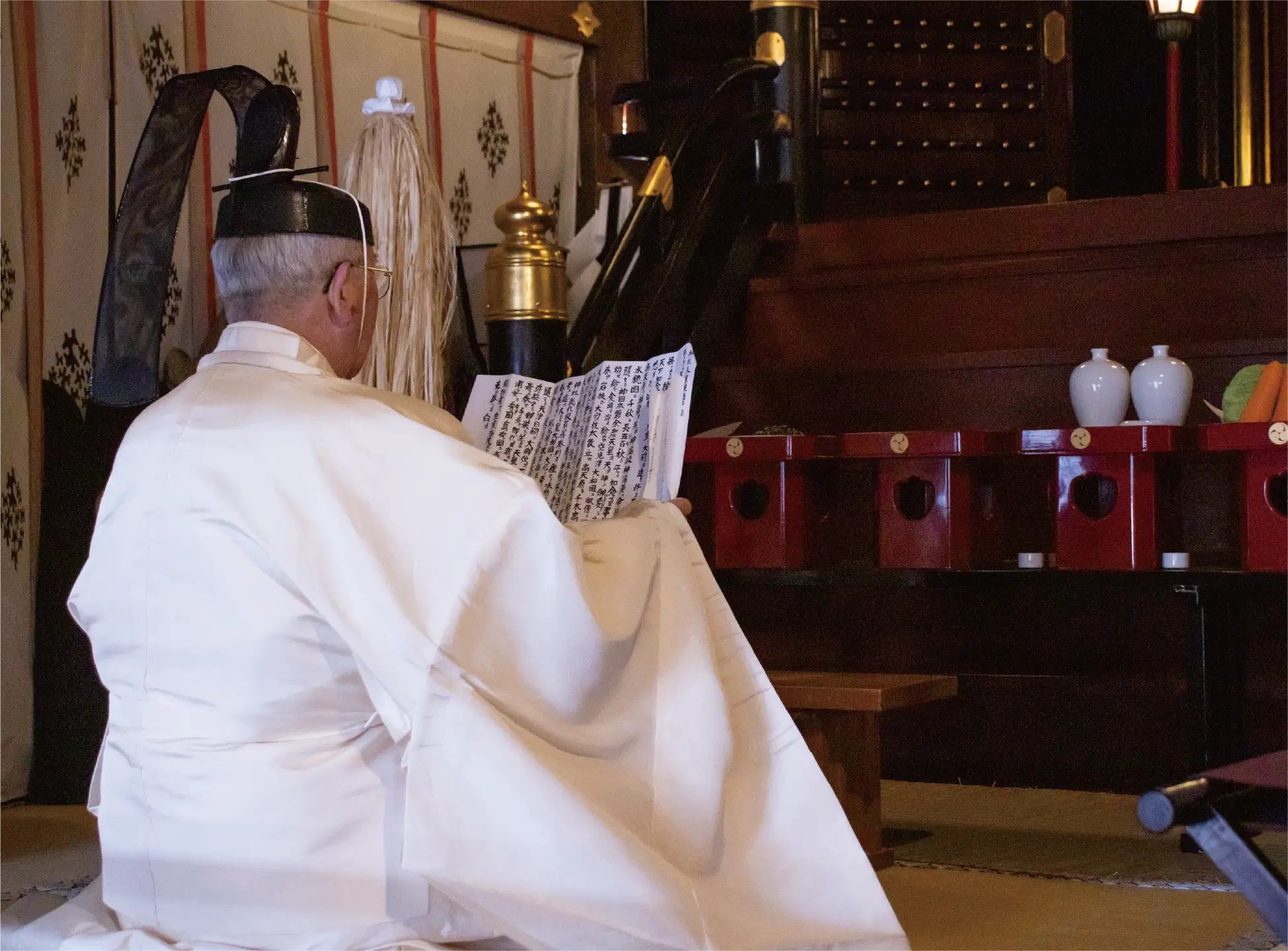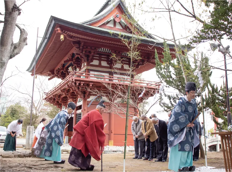 火之迦具土神は、災除けや鍛冶、火を扱う産業の守護神として信仰され、破壊と再生、浄化の力を象徴する神としても重要な存在です。記紀に登場する火の神で、イザナミとイザナギの子とされています。誕生時に母イザナミを焼き死なせてしまい、怒った父イザナギに斬られますが、その体からは多くの神々が生まれました。火災除けや鍛冶、火を扱う産業の守護神として信仰され、破壊と再生、浄化の力を象徴する神としても重要な存在です。当宮では、末社迦具土社で宮司により祝詞が奏上され、参列した総代と共に玉串奉奠が行われます。