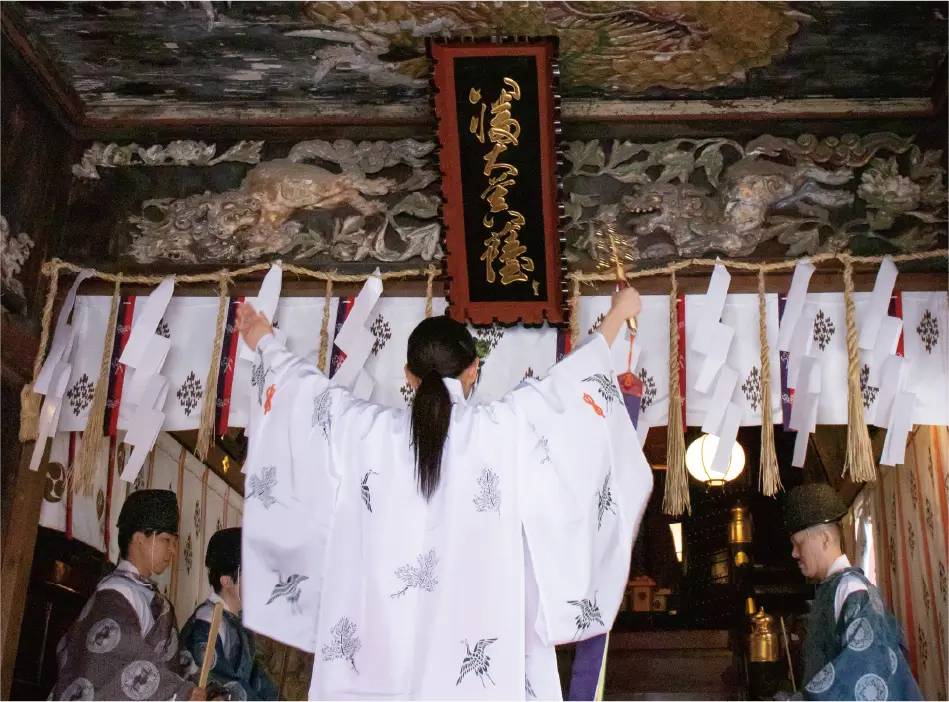 初卯祭は、立春後の最初の卯の日に行われる祭典です。平安時代中期ごろから八幡神の誕生をお祝いし、全国の八幡社で無病息災を祈る祭典を執り行われています。祈年祭は、春の田植え・耕作に先立って一年間の豊作を祈り行われる大切な祭典です。日本書紀には天皇が五穀の豊穣を祈って諸神に幣帛を奉る様子が記されています。当宮では、信仰や農耕文化を象徴する2つの祭典が同時に執り行われます。宮司により祝詞が奏上され、巫女による浦安の舞が奉納されます。その後、参列した総代と共に玉串奉奠が行われます。